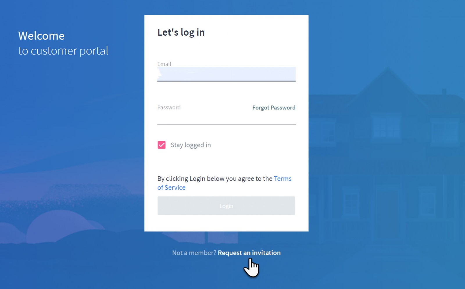 Click on the link to arrive at the login page, then click Request an invitation to register for your Customer Portal.