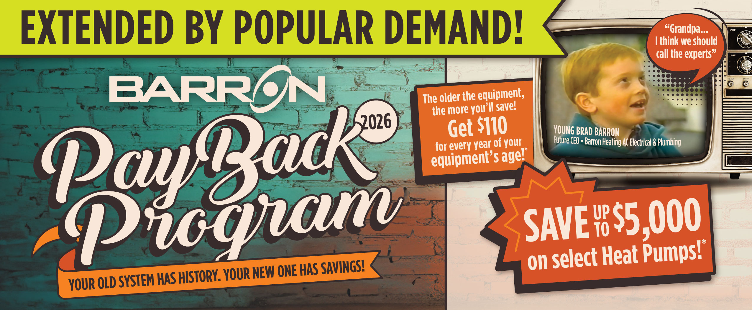 Barron’s historic Pay Back Program has been extended by popular demand! Heating, Cooling, Water Heaters, Fireplaces, Solar, and more! SAVE BIG on everything Barron Installs!