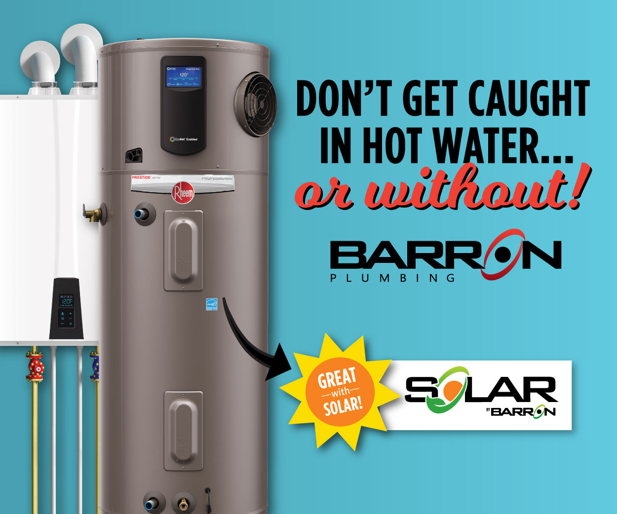 Get $200 OFF a Storage Tank Water Heater, $400 Off a Tankless Water Heater, or $400 OFF a Heat Pump Water Heater (ask our team about how these go great with solar).